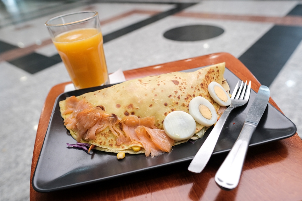 Especialidades: crepe de salmão fumado e tosta em pão alentejano com tomate e oregãos.