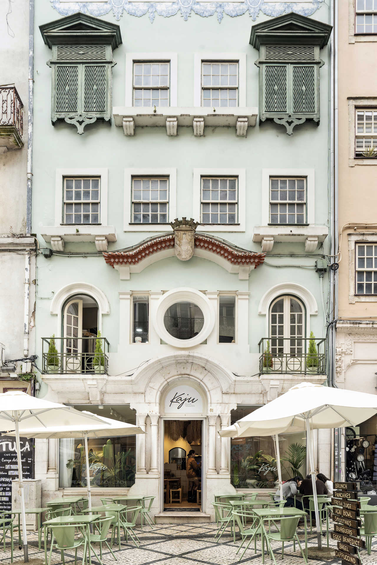 A fachada do edifício é verde menta, a esplanada tem mesas e cadeiras a condizer e, no interior, dominam os tons claros, das madeiras à palhinha, passando pelas peças decorativas em macramé. As plantas ajudam a compor o cenário, inspirado nos ambientes de Bali, na Indonésia, e de outros países asiáticos – uma influência que se estende aos pratos, como explicam Tiago de Carvalho e Juliana Rodrigues. São eles os responsáveis pelo Kaju – Brunch Restaurant, inaugurado no verão passado, na Rua Visconde da Luz, em Coimbra.