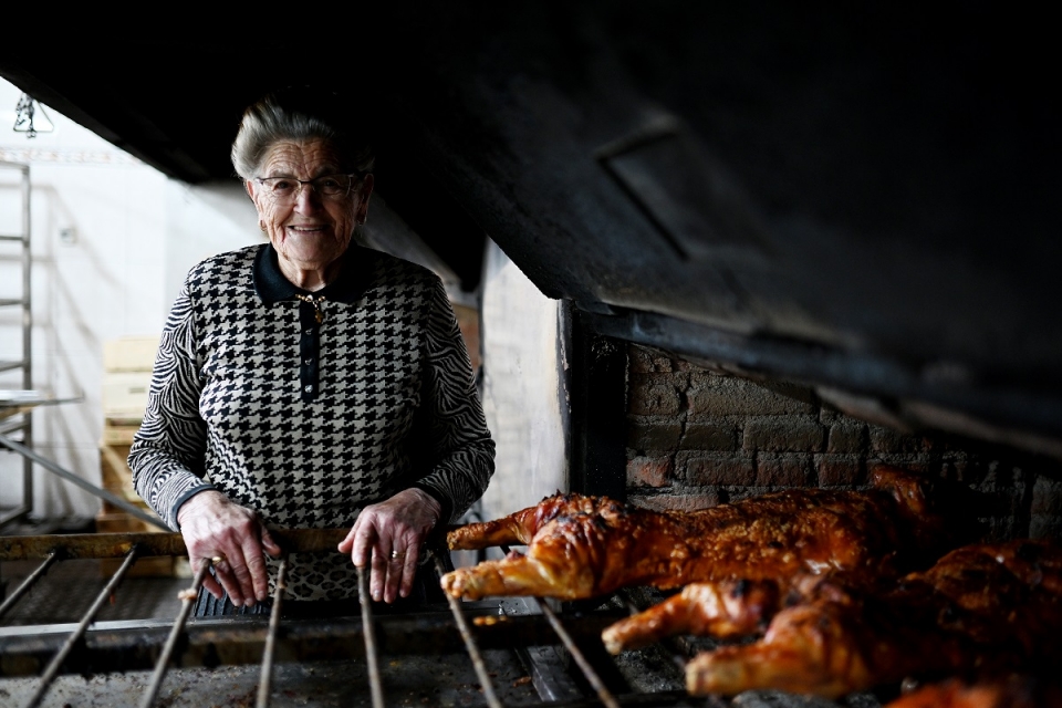 Aos 87 anos, Tia Alice posa para a fotografia junto aos três fornos a lenha onde se assa o leitão há quase duas décadas e meia. “Alguma há-de ficar boa”, ri-se a matriarca, de graça e simpatia exímias, que já no final dos anos 1950 vendia leitão nas feiras e mercados da zona, com o marido, António. É ela quem deu nome ao Tia Alice, uma das paragens obrigatórias quando se fala em leitão de Negrais, concelho de Sintra, e que é sinónimo de casa cheia. “Metade do nosso público vem cá desde o primeiro dia”, conta Silvéria Santos, filha da Tia Alice, que gere o restaurante familiar com a ajuda das três filhas, Lurdes, Teresa e Alexandra – esta última mais ligada ao espaço homónimo que surgiu depois no Loures Shopping.