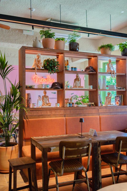 Puxando o ambiente de praia para dentro do espaço, e sobretudo para a esplanada exterior equipada com guardassóis exóticos, o Nicolau Cascais vende chinelos de praia e bonés exclusivos, e terá bolas de praia insufláveis. Quem conhece os outros espaços sabe que ali também pode comprar as kombuchas e manteigas de amendoim caseiras. A ligação à natureza torna-se ainda evidente com as várias plantas de interior que adornam o espaço, e que são tratadas por uma florista da vizinhança.