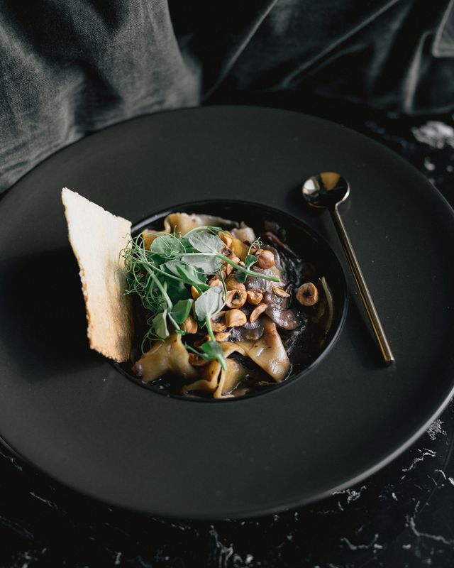 Para compôr a mesa vale a pena dividir também as gyosas botânicas (duo de shimeji e cogumelo paris, nabo, sementes de sésamo, gengibre e molho ponzu) e pedir como pratos principais o Bela Ciao (papardele caseiro, cogumelos em vinho tinto, avelãs fumadas e trufa) e o Amuleto (tofu marinado, tamarindo, alho negro, velouté de batata doce, crocante de brioche e alho francês grelhado).
