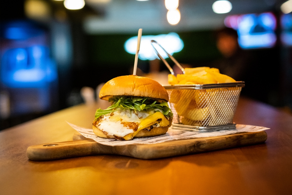 Essa “pegada” é feita com “variedade, juventude e com um bar”, que convida a ficar mais tempo a conviver depois do jantar. Atrás do balcão brilha a geração mais nova da família Ligeiro: Guilherme, responsável pelo serviço, e António, que trata dos cocktails. Na carta, sobressai a variedade. Há a secção de “smash burgers”, hambúrgueres prensados, “mais fininhos, assados de forma uniforme”, explica Guilherme. Nos “normais”, o cliente escolhe o seu ponto de carne favorito. Os best-sellers da casa são dois: o Original, com 180 gramas de Black Angus, cheddar, bacon panado, alface, tomate e maionese verde; e o Vulcano. Este é um hambúrguer em pão preto, com queijo cheddar derretido, que é colocado no momento de servir. “Quando se vê o queijo a derreter é um show à parte”, diz. Há também sugestões premium, como o Burger Wagyu, feito com 200 gramas desta raça bovina japonesa, maionese de trufa, queijo brie, presunto, rúcula e tomate. Nas entradas, o estendal de bacon panado, as coxinhas e bolinhas de queijo destacam-se.