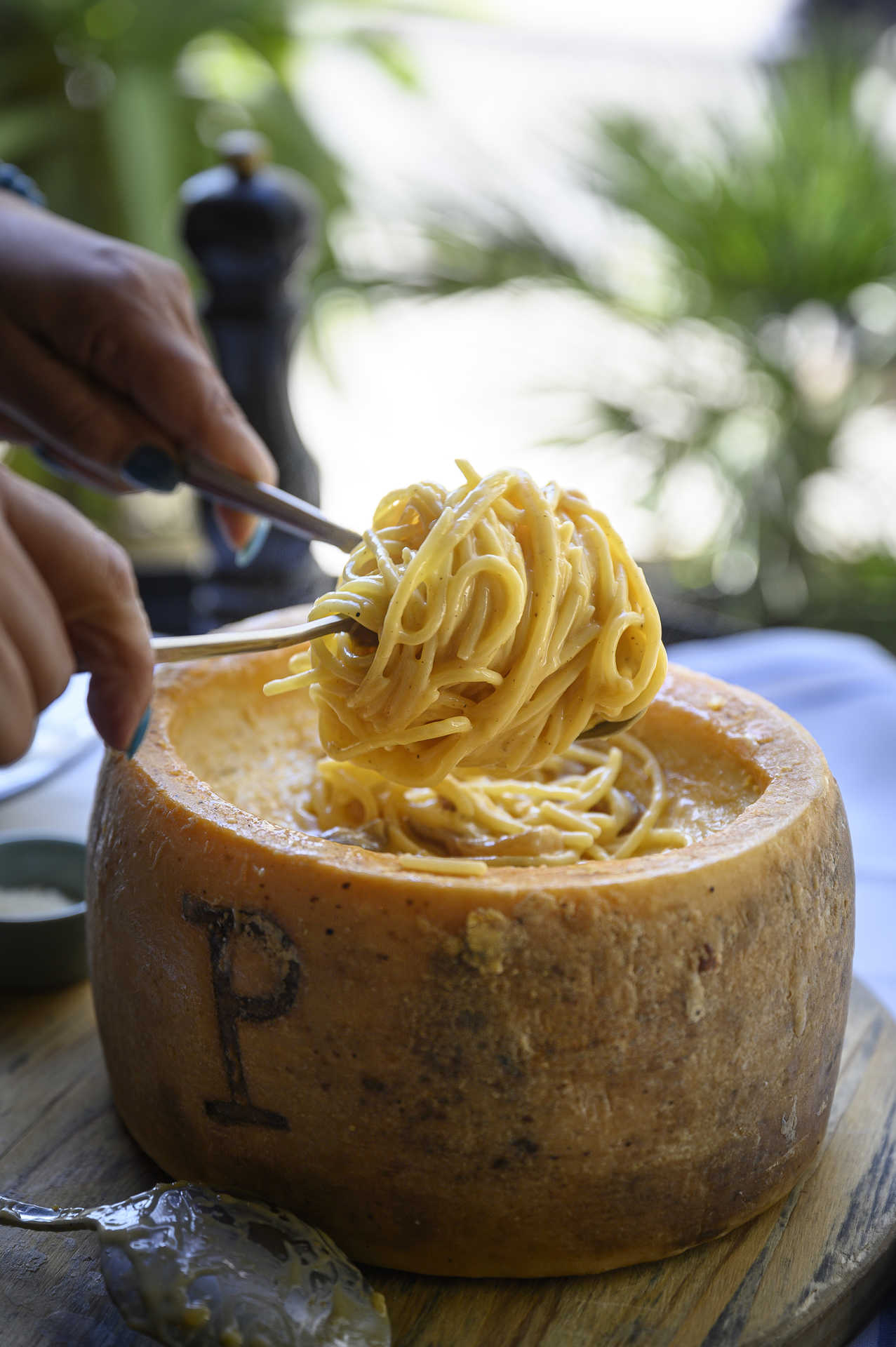 Entra-se em domínio mais marcadamente italiano nos pratos centrais. Experimenta-se um cremoso e equilibrado spaghetti do mar. Festeja-se o spaghetti alla carbonara em queijo pecorino, espesso, o mergulho da massa no queijo efetuado à frente do cliente, e com uma arma secreta sob a forma de bacon guanciale, em pequenas tiras levemente tostadas – é dos pratos mais populares, diz Jorge Oliveira, a par do risotto de ceps também em pecorino. E ainda se arranja espaço para um t-bone (tenro, bem marcado pela grelha) com alecrim e batata frita, pensado na sua vastidão para duas pessoas.