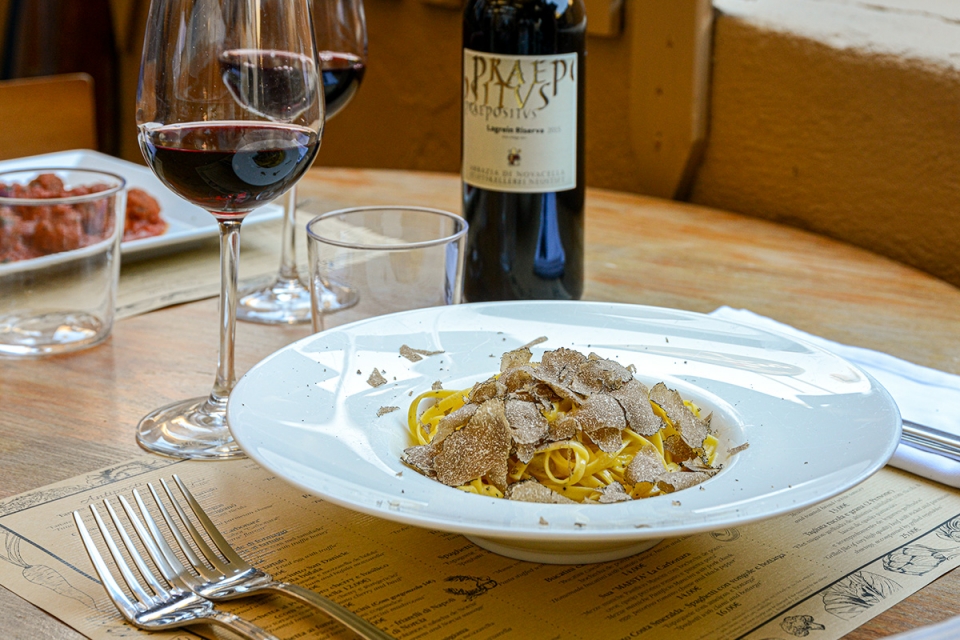Entre a conversa e um bom vinho deita-se um olho à carta do Il Matriciano, apresentada nos individuais de mesa, e que agora tem novos pratos de verão. São eles a costeleta de vitela panada com batatas assadas; o tagliolini com gambas e tomate datterini; e o polvo “zangado” com molho de tomate e piri-piri com um pão fino e estaladiço típico da Sardenha. A trufa de verão é por estes dias utilizada para rematar alguns dos pratos.