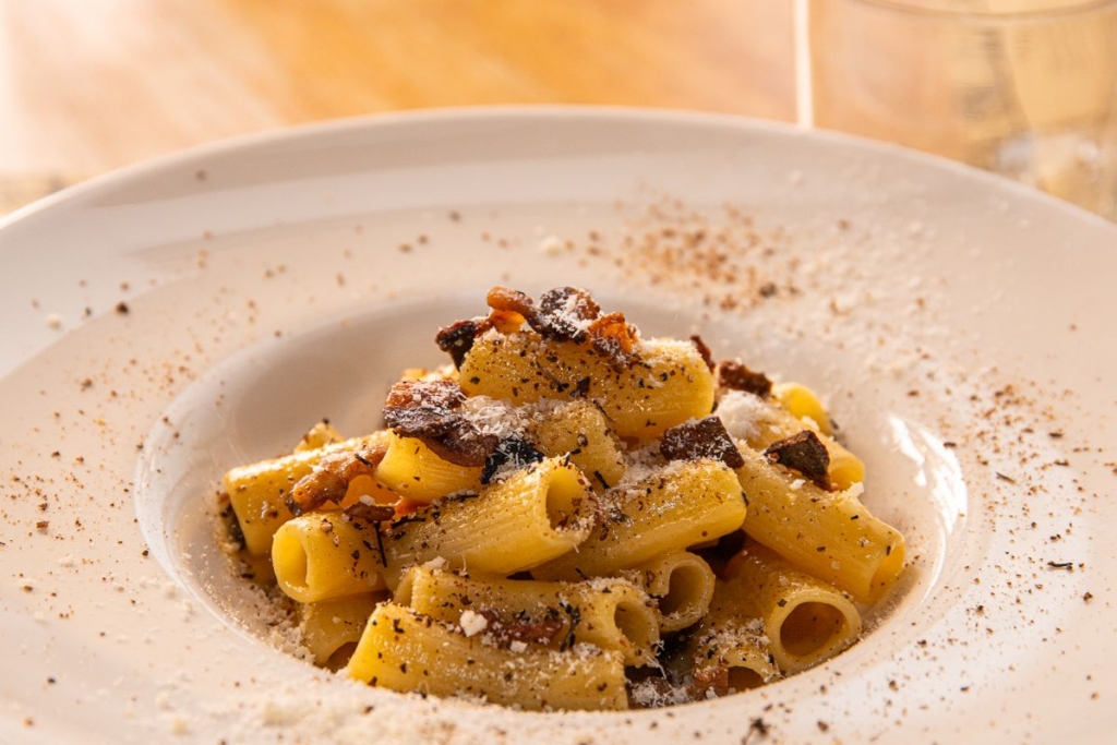 Fala-se, claro está, de “sua maestá la carbonara”, feita com massa mezze machine, bochecha de porco e queijo pecorino romano e pimenta preta; e da massa matriciana, feita com tonnarelli, molho de tomate, bochecha de porco e piri-piri. Nas entradas, são muito pedidos o tártaro de carne com queijo parmigiano e bochecha de porco e a tarte de batata com mortadela de Bolonha, pistachio e fondue de parmesão.