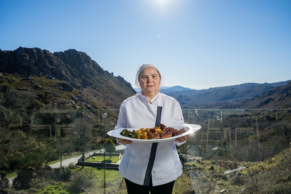 “Já deu três voltas”, conta a cozinheira, referindo-se ao crescimento do restaurante ao longo do tempo. A última “volta” foi em 2021, em plena pandemia, quando a família que gere o restaurante cujo nome diz tudo sobre a vista privilegiada para a serra da Peneda e castelo de Castro Laboreiro, investiu na criação de uma sala ampla, com cem lugares, toda envidraçada, onde era um antigo terraço. Dali, avistam-se na encosta antigas inverneiras, aglomerados de casas onde a população se recolhia no Inverno, quando deslocava o gado das zonas altas com a chegada do frio (transumância).