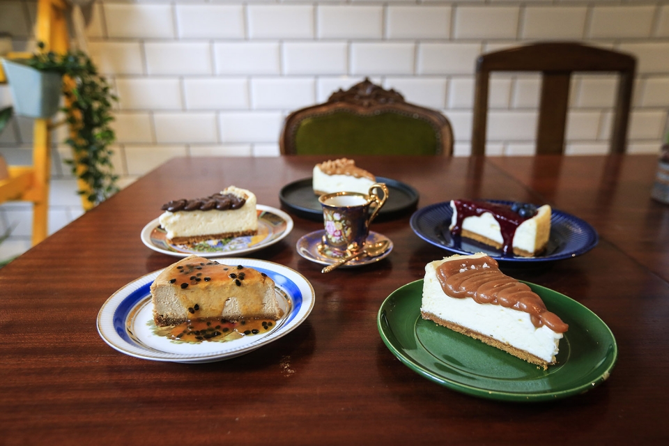 Agora, na pequena zona de café e na esplanada das traseiras, saboreiam-se diversos cheesecakes, recheados com uma massa fofa – a fazer lembrar uma mousse – e de açúcar no ponto, feita apenas com queijo Philadelphia, sem gelatina, leite condensado ou natas. A escolha prende-se com a leveza que proporciona à massa, com o sabor neutro e o travo ligeiramente salgado que fica no fim de boca. Por baixo, espreita uma base feita com bolacha digestiva, e por cima, em cremosos ziguezagues, tanto pode haver caramelo salgado, como baba de camelo, creme de pistácio, lemon curd e compotas caseiras de maracujá ou frutos vermelhos.