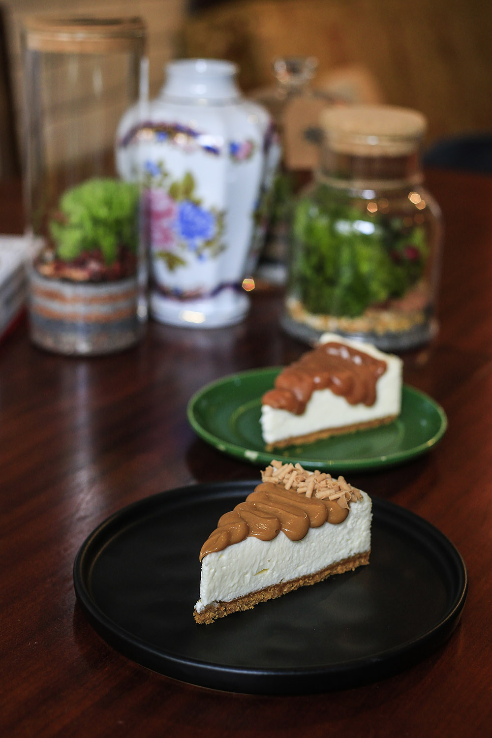 Agora, na pequena zona de café e na esplanada das traseiras, saboreiam-se diversos cheesecakes, recheados com uma massa fofa – a fazer lembrar uma mousse – e de açúcar no ponto, feita apenas com queijo Philadelphia, sem gelatina, leite condensado ou natas. A escolha prende-se com a leveza que proporciona à massa, com o sabor neutro e o travo ligeiramente salgado que fica no fim de boca. Por baixo, espreita uma base feita com bolacha digestiva, e por cima, em cremosos ziguezagues, tanto pode haver caramelo salgado, como baba de camelo, creme de pistácio, lemon curd e compotas caseiras de maracujá ou frutos vermelhos.