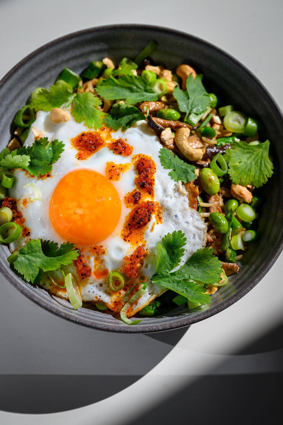 Às mesas chegam as propostas vegetarianas e veganas assinadas pelo chef João Pupo Lameiras, ricas em sabores do mundo. Apesar de a carta não distinguir entradas dos pratos principais, há porções maiores ou mais pequenas, consoante o apetite. Por exemplo, a sopa de cebola e alho-francês, com brie e tomilho; a batata-doce frita, muito suave no interior, coroada com maionese vegana e ervas; e o KFC – Korean Fried Cauliflower, o único prato que migrou da carta do Espécie; são boas opções para arrancar da refeição, ou para combinar entre si. Já o arroz frito com espargos, cogumelos shiitake, edamame, ovo estrelado; e o condimentado kare de tofu, acompanhado com couve e pickles; apresentam-se em tamanho mais generosos, ideais para repartir por dois. Da lista com 15 pratos, onde mais de metade são receitas veganas, consta ainda katsu sando de beringela, baos de shiitake e grilled cheese.