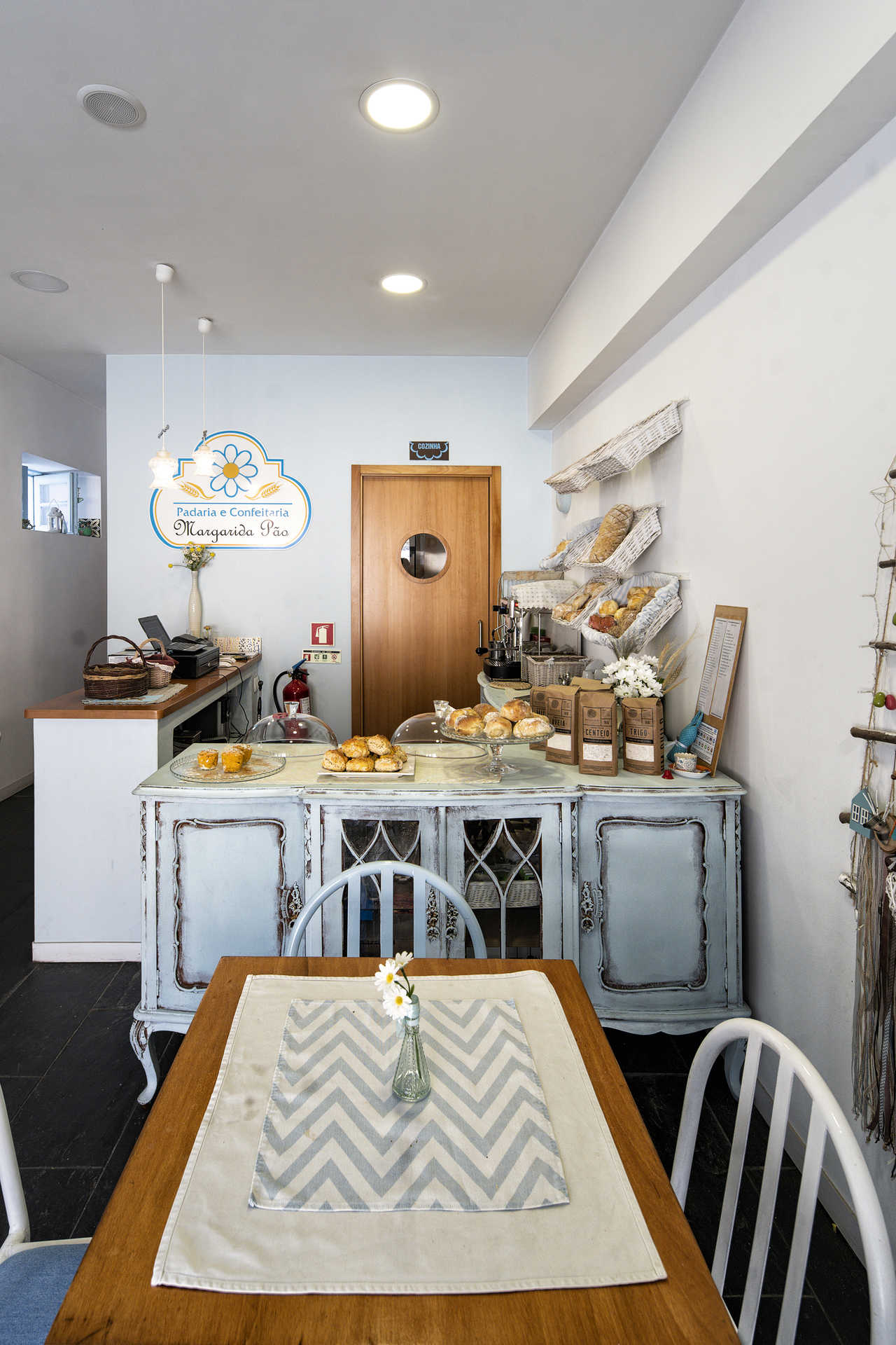 Uma bonita porta azul claro, coroada por um painel que anuncia o nome do lugar, dá passagem à aconchegante sala da Margarida Pão. Parece uma casa de bonecas, decorada com móveis restaurados, em tons pastel, e uma jarrinha com margaridas no centro de cada mesa.