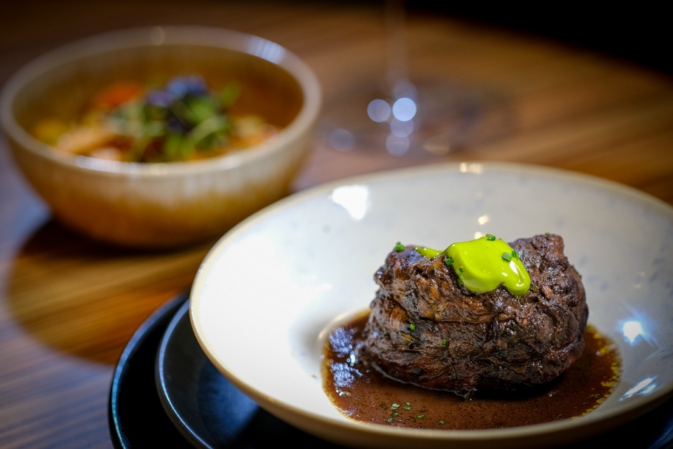 O pernil é cozinhado de forma lenta no sous-vide, durante 12 horas em vinho tinto, e vai ainda à brasa, até porque a cozinha de lume é um dos pilares desta casa alfacinha, situada entre o Cais do Sodré e o Terreiro do Paço. A proteína recebe uma infusão de ervas (tomilho, alecrim, coentros), além de alho e azeite, e acompanha à mesa com uma geleia de hortelã, cuscuz marroquino e um molho enriquecido à base do vinho tinto usado. Para os leitores da Evasões, adapta esta receita para uma versão mais simples e fácil de replicar em casa.