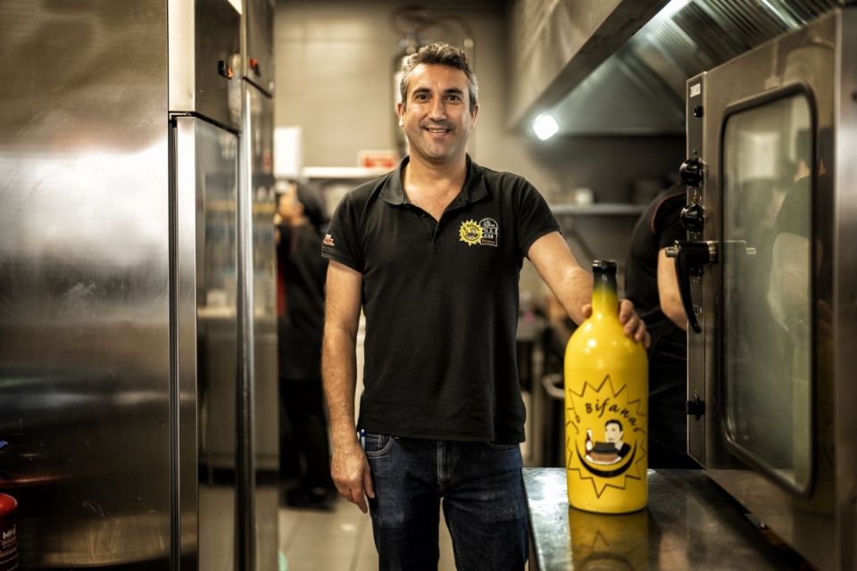 Com a pandemia – que obrigou à distribuição de bifanas ao domicílio -, deu-se a mudança para um espaço maior: este onde nos encontramos. Numa parede, há uma fotografia de uma rua cheia de gente, tirada naquilo a que se chamou, por brincadeira, “Confraria da Bifana do Jó”. Essa festa anual, com direito a DJ e rua fechada ao trânsito, leva mais de uma década de existência. Neste ano, acontece no dia 27 de abril, a partir das 18 horas e madrugada dentro, prometendo, além de bifanas, pastelaria tradicional, cerveja artesanal e gin.
