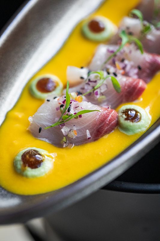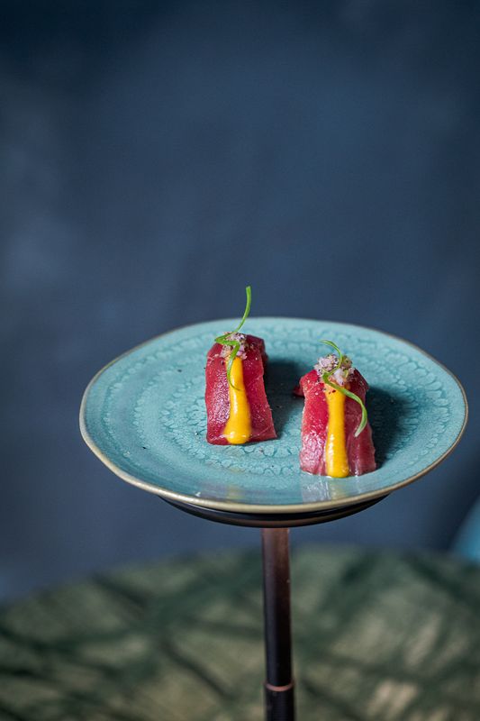 O ceviche de atum vermelho com leite de tigre, ponzu e alga crocante permite, por sua vez, entender as diferenças entre os dois países, pois ao contrário do original não leva milho. No capítulo dos nigiris há-os de vieira trufada, polvo com molho de azeite e atum vermelho com foie gras, entre muitos outros. Já nas entradas, vale a pena provar as gyosas recheadas com santola e pimenta amarela, com molho de frutos do mar e espuma de queijo, antes do lombo com cebola roxa, tomate, cogumelos, ostra, soja, mandioca frita e arroz de milho.