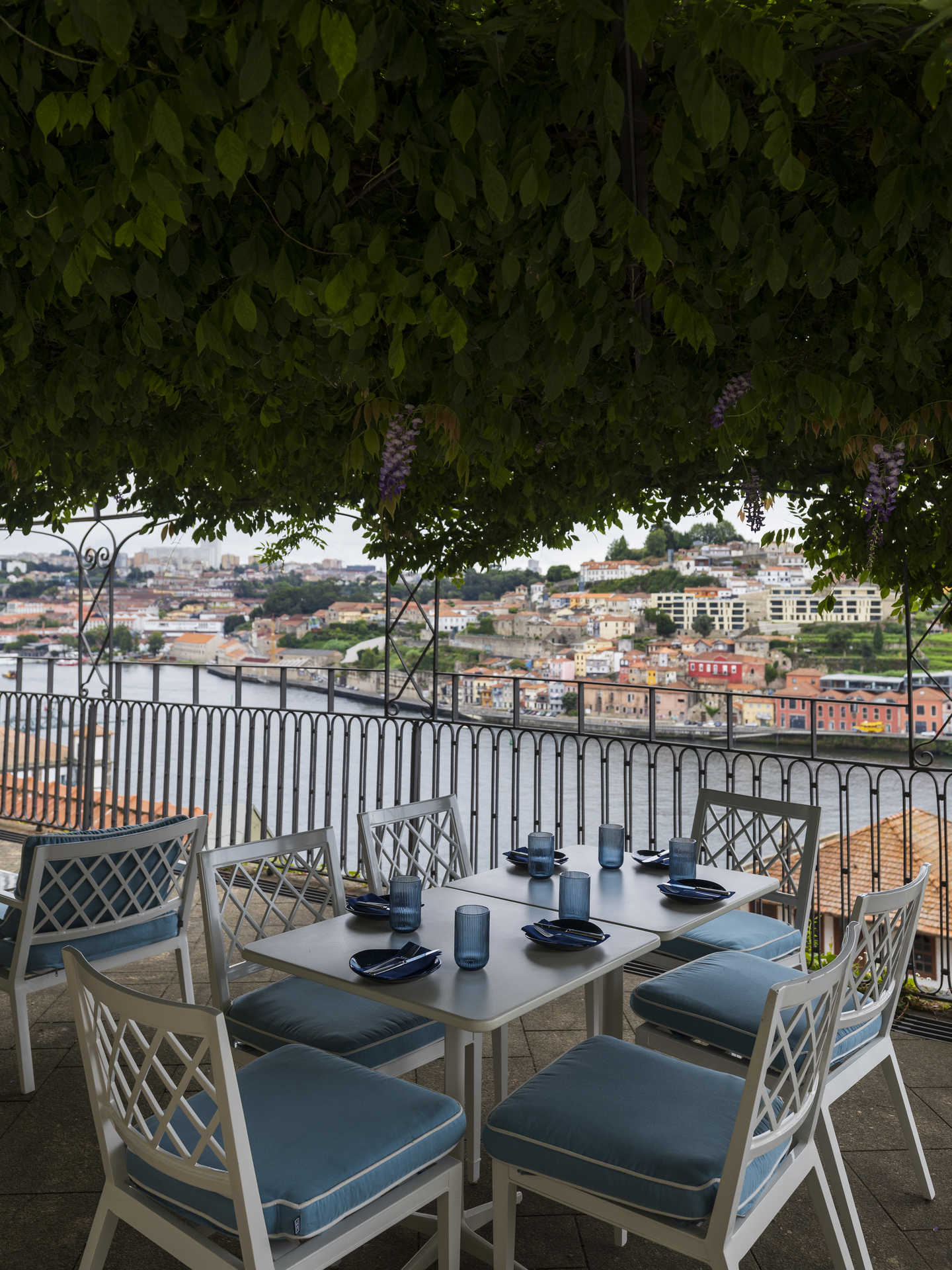 O Basquiat tem uma sala interior que serve o pequeno-almoço aos hóspedes da Maison Bleue, “Luxury Guesthouse & Art” inaugurada no outono de 2023, uma casa senhorial oitocentista com 11 quartos. Abre-se um terraço para as encostas do Porto e de Gaia, com o Douro pelo meio – espaço para refeições, sunsets e festas várias, mais uma área lounge relvada. Abaixo, um salão panorâmico para eventos e exposições.