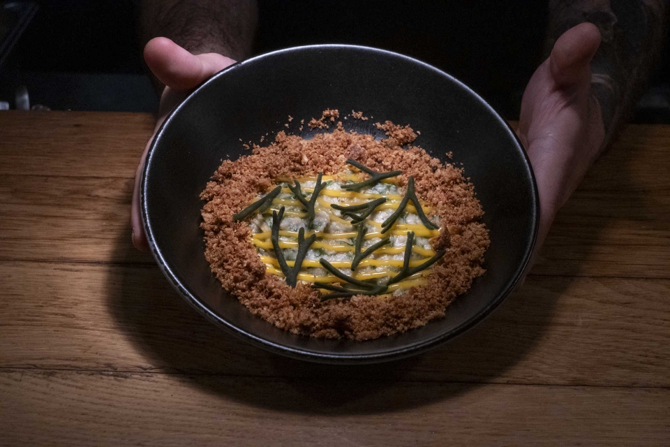 Rúben Santos diz que um toque de arrojo faz parte da filosofia do restaurante, embora nem todos os pratos sejam assim – alguns até vão buscar a cozinha portuguesa na sua essência, como a açorda de berbigão ou a sua versão do bacalhau à Brás, para quem queira “arriscar menos”. “Mas depois também temos um caril verde que é um mix de Tailândia e Japão; e um prato de ravioli que, à partida, seria italiano, mas cujo molho é baseado no mexicano birria”, exemplifica.