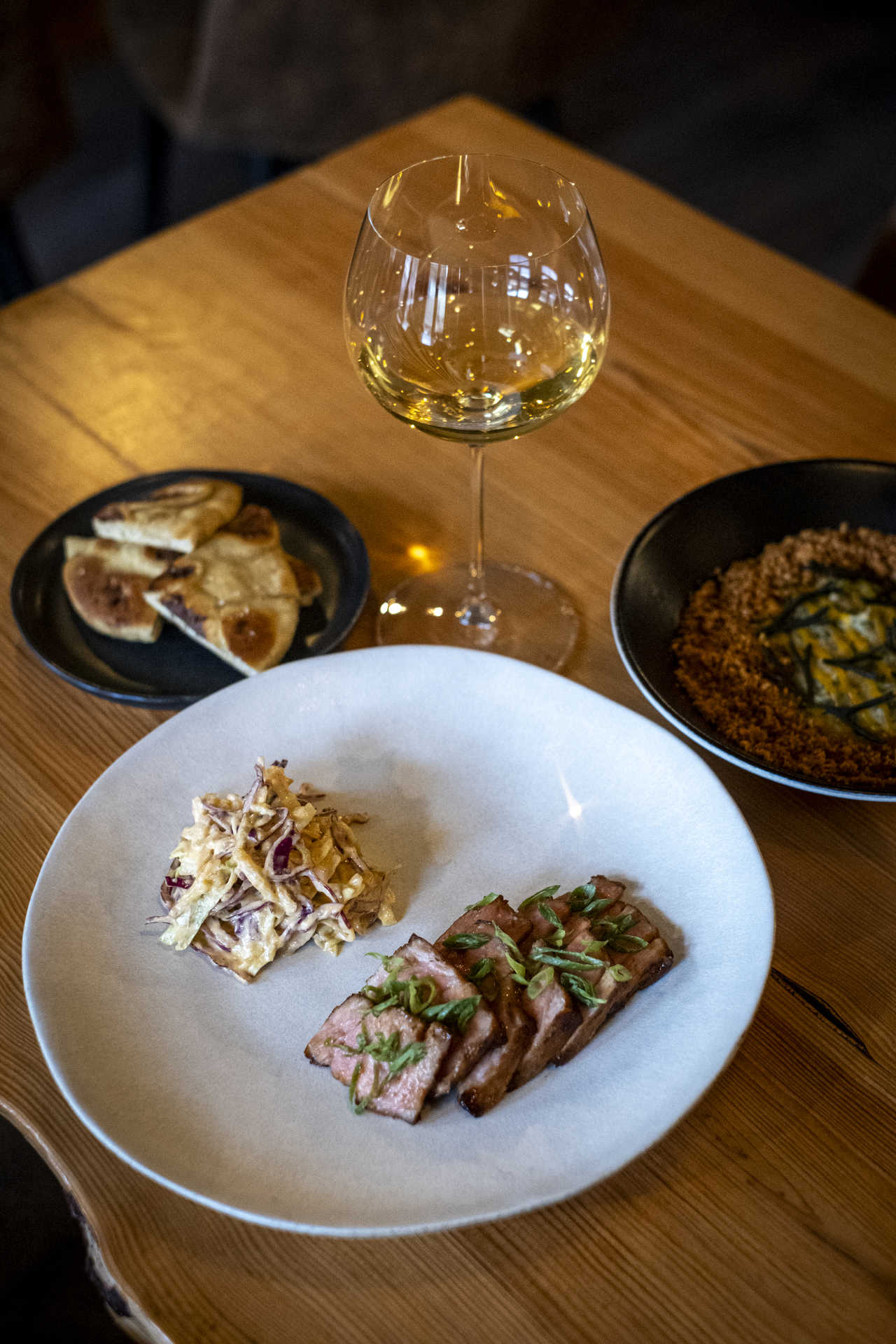 A ideia de partilha não se esgota numa garrafa, aplicando-se também aos pratos, que saem da cozinha com apresentação esmerada, sem se amarrarem a uma narrativa. No Éter (nome que remete para “algo volátil, que não cabe em espaços físicos”), o chef Rúben Santos quis fugir à “intelectualização gastronómica”: “Não estamos agregados a um pré-conceito, e isso acaba por nos dar mais liberdade”.