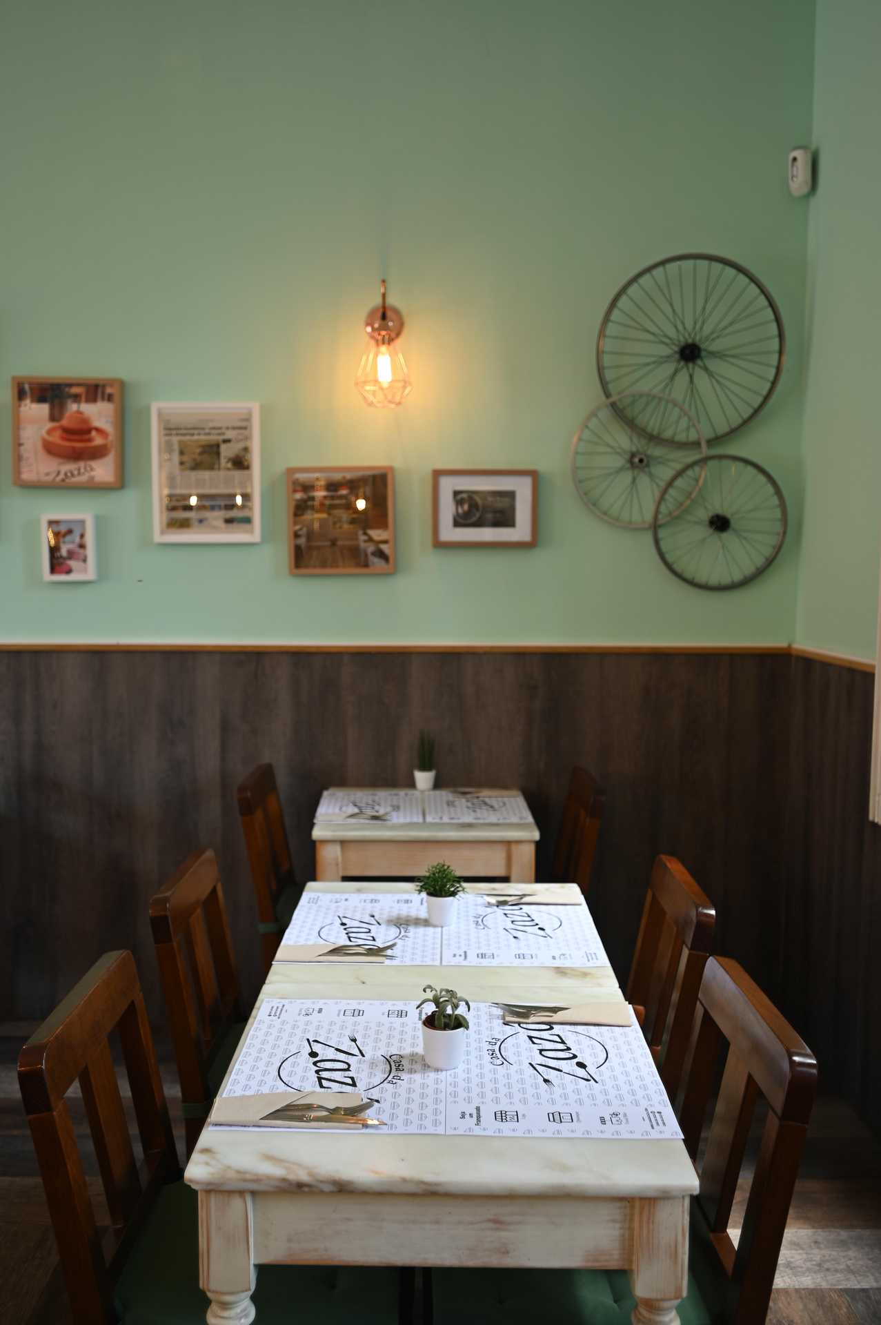 Os tons pastel, à semelhança do espaço de Setúbal, dominam a decoração, marcada ainda por uma parede forrada com artigos de jornais e revistas emoldurados. «É a nossa história que está aqui», lança Victor. Há também lugar para fotografias: do João, na cozinha a moldar empadas, e da Zazá, sua mãe, em quem se inspirou para dar nome ao restaurante, em jeito de homenagem.