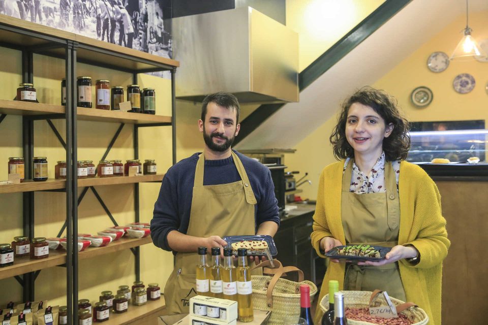 A Trazmontes tem grande diversidade de artigos para comer e beber: fumeiro, queijos, azeites, vinhos, uma cerveja artesanal feita com mel biológico, em Montalegre, bolos, compotas, marmeladas de amora e de framboesa e alguns produtos a granel, como grão, feijão ou nozes. Isto só na primeira sala, que acolhe a mercearia. Porque a seguir há um espaço onde se pode saborear praticamente tudo o que está à venda. “Do menu, só a rúcula é que compramos. É uma maneira de mostrar que confiamos nos produtos”, explica a gerente, Elza Alves.