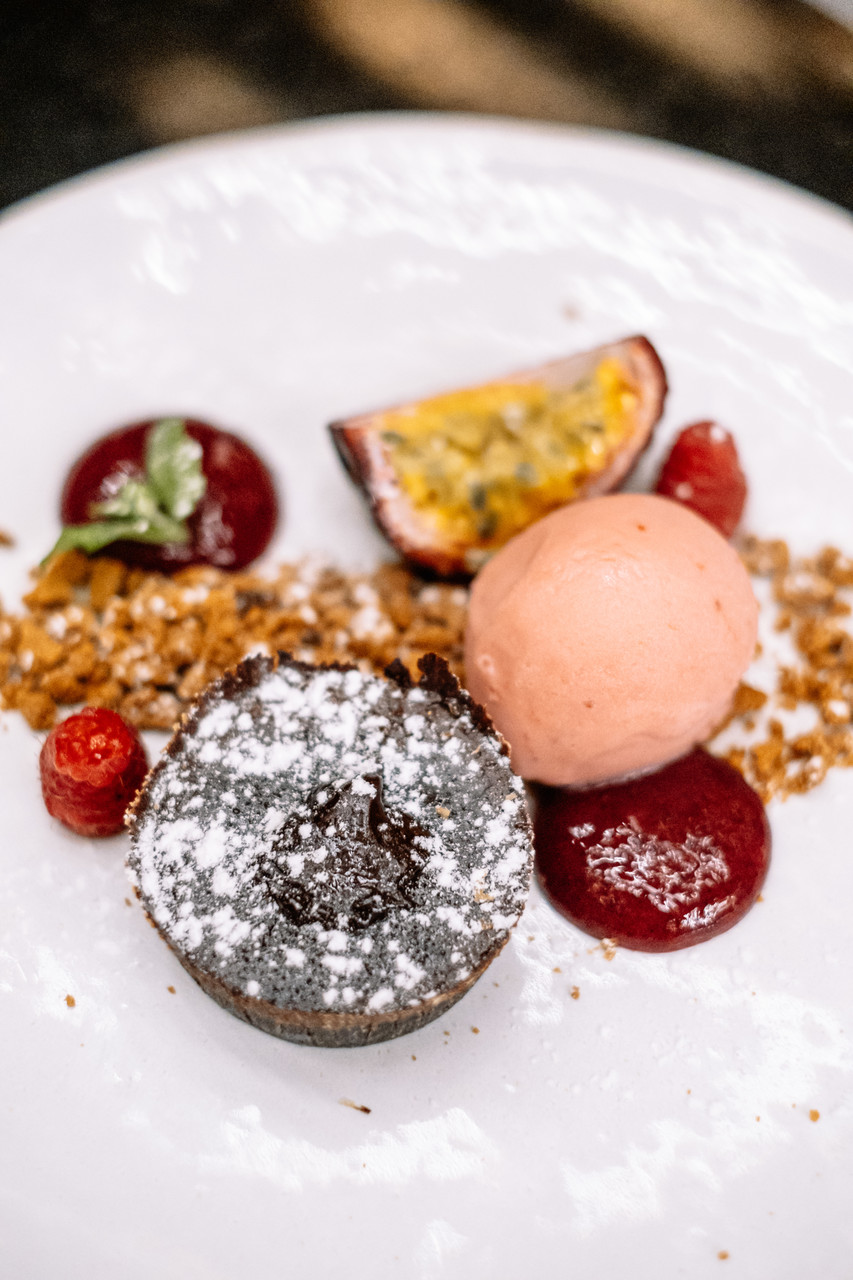 O jantar começa com uma bebida de boas-vindas. Ao couvert (que inclui pães de fermentação natural e manteiga aromatizada) segue-se um amuse-bouche, uma entrada, um prato de peixe, outro de carne e, por fim, a sobremesa. Aquando da nossa visita, houve ceviche de corvina, caviar de limão e lascas de coco; cremoso de beterraba, pasta de roquefort e amendoim e abacate assado; ou vazia maturada, puré de pastinaga, cogumelo eryngii grelhado e molho de pimenta verde. E esses foram só alguns momentos de um menu que, como comprovámos, pode ser adaptado a vegetarianos – tal informação deve ser transmitida no ato de reserva, sendo o mesmo válido para intolerâncias e outras restrições alimentares.