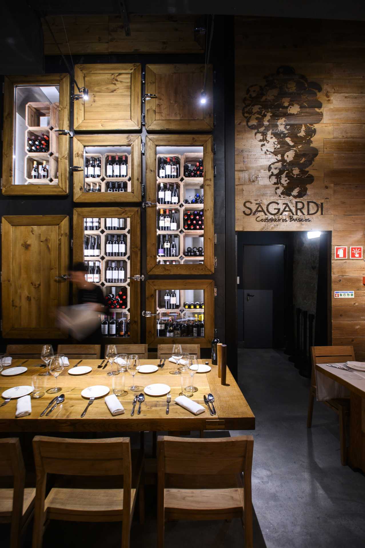 É este o cartão de visita do Sagardi – Cozinheiros Bascos, o novo restaurante basco do Porto, que abriu na Ribeira, no rés do chão e cave de um prédio antigo, que se tornou um espaço muito acolhedor. Tem a forma de uma taberna contemporânea de tetos altos e muita madeira, despojada e com as paredes forradas até cima de garrafeiras, frigoríficos com enormes nacos de carne e, no piso superior, um balcão cuja vitrina exibe dezenas de fatias de pão com algo apetitoso por cima – bacalhau, chouriço, presunto, queijo, carne, com guarnições coloridas e frescas.