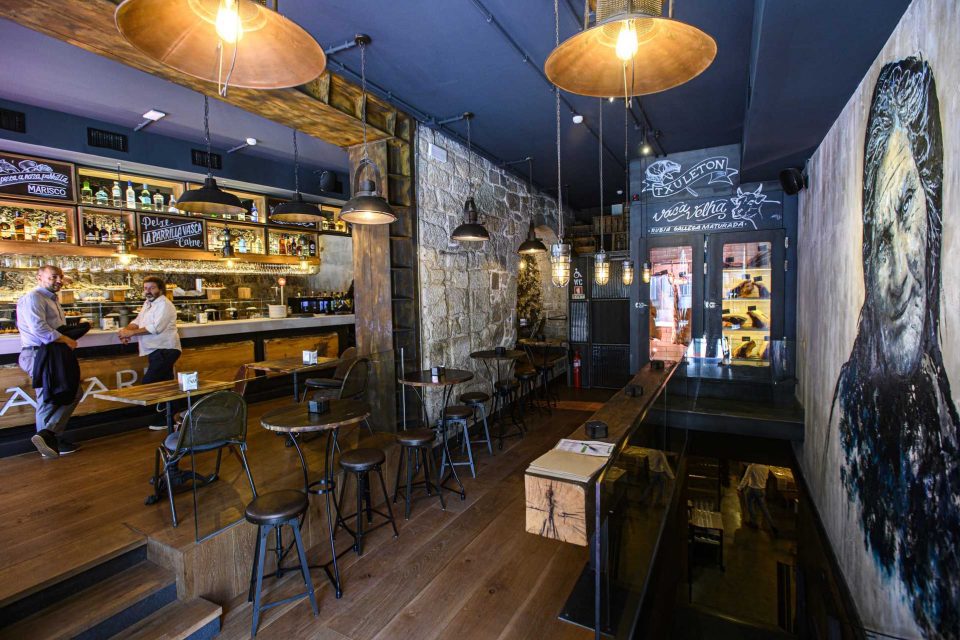 Junto a essa “barra de pintxos”, há mais movimento, e o espaço foi concebido para isso mesmo: o piso térreo é um lugar de petiscada, que se escolhe ao balcão entre a oferta do dia; enquanto que, na cave, fica uma sala para comer mais pausadamente. Ali, pode-se escolher de uma carta cujas estrelas são o “txuletón” – o costoletão de vaca ou boi velho, maturado à maneira basca e servido tenríssimo depois de grelhado na brasa apenas com sal – e o peixe fresco, também passado na grelha e servido com guarnições mínimas, como um molho de manteiga.