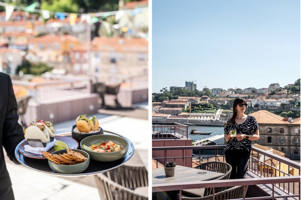 Pelas ruas estreitas de Miragaia se chega ao Hotel das Virtudes, nascido da recuperação de um edifício, com raízes no século XVI, que já foi armazém, fábrica e residência aristocrática. Ana Reis, diretora de comidas e bebidas deste novo cinco estrelas, guia-nos pelos diferentes andares, até chegar ao quinto, onde fica o Amura Bar & Rooftop Lounge, com vista para o Douro, a Alfândega, os telhados e as casas coloridas. É ele que nos traz aqui. Mas aproveitamos para conhecer outras facetas da casa, inaugurada, há pouco mais de um ano, numa zona do Porto onde ainda se ouve galos a cantar, ainda se vê roupa a secar e crianças a jogar à bola na rua.