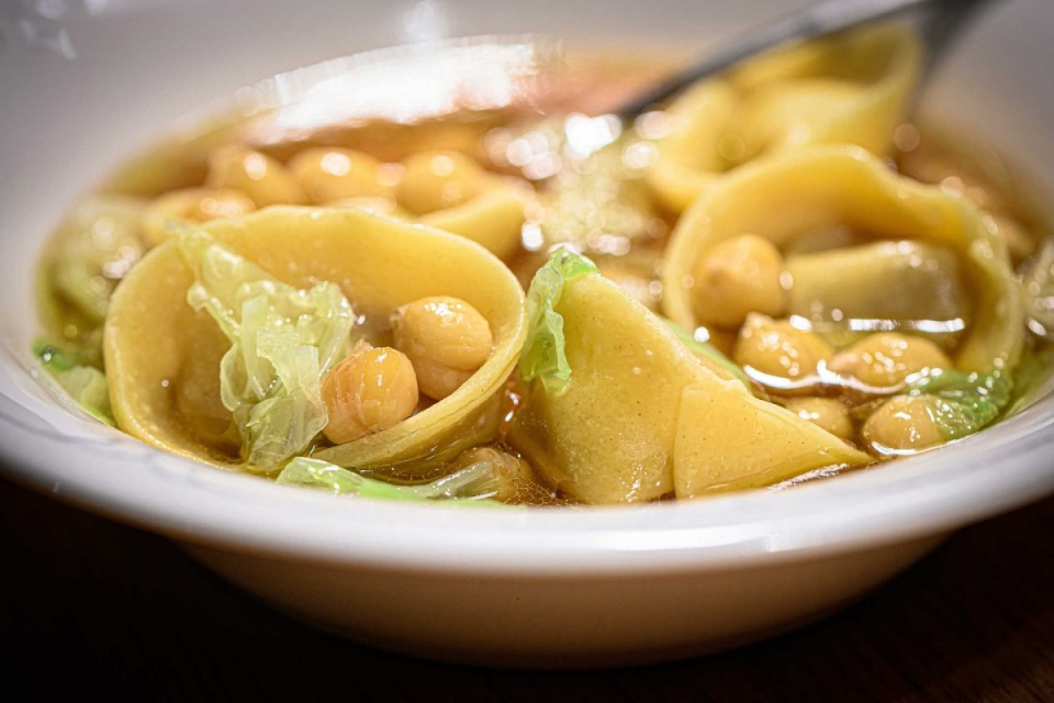 Essa complementaridade traduz-se numa carta em que é trabalhada a componente da portugalidade, com referências e técnicas de outras tradições. “Temos um forno de piza que aproveitamos para fazer, por exemplo, o nosso flatbread de sardinha”, conta João. Francisca, que passou por The Yeatman e trabalhou em vários espaços em Londres, como a Taberna do Mercado, de Nuno Mendes, ou os estrelados Portland e Casa Fofó, italiano de fusão, chama ao que fazem “cozinha portuguesa contemporânea com influência de alguns sítios por onde nós passámos”. Um dos pratos que melhor espelha essa filosofia é o ravióli de cozido, feito de carnes do cozido desfiadas e regado com o caldo com grão de bico.