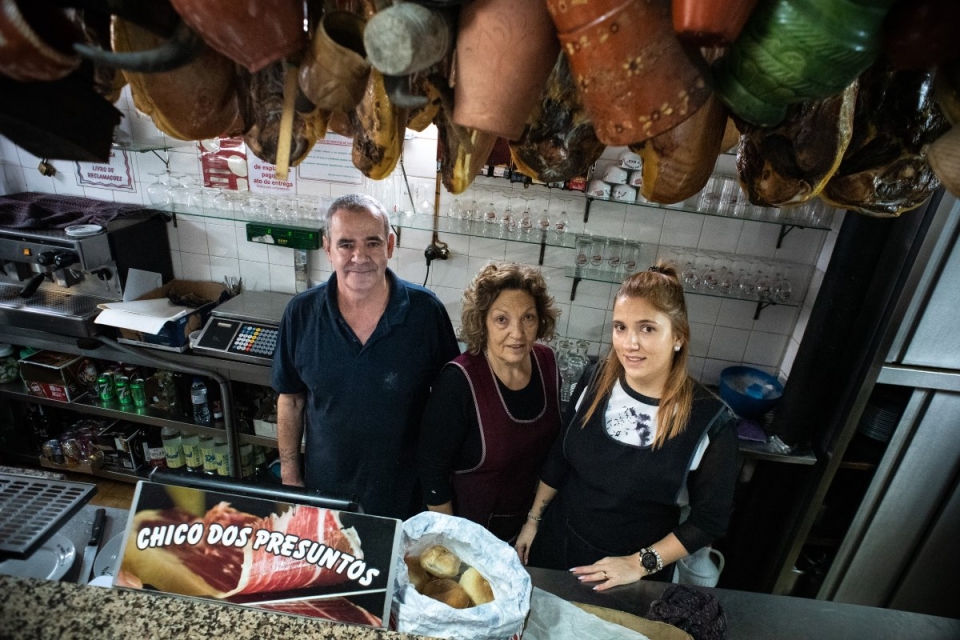 Pouco passa das 10 horas e o Xico do Presuntos já tem a casa composta. Na meia dúzia de mesas e ao balcão, come-se sandes e bebe-se um copo. Mas é à hora do almoço e durante a tarde que a casa enche. Os clientes são atraídos pelos muitos petiscos que saem do fogão de dois bicos gerido pela D. Helena.