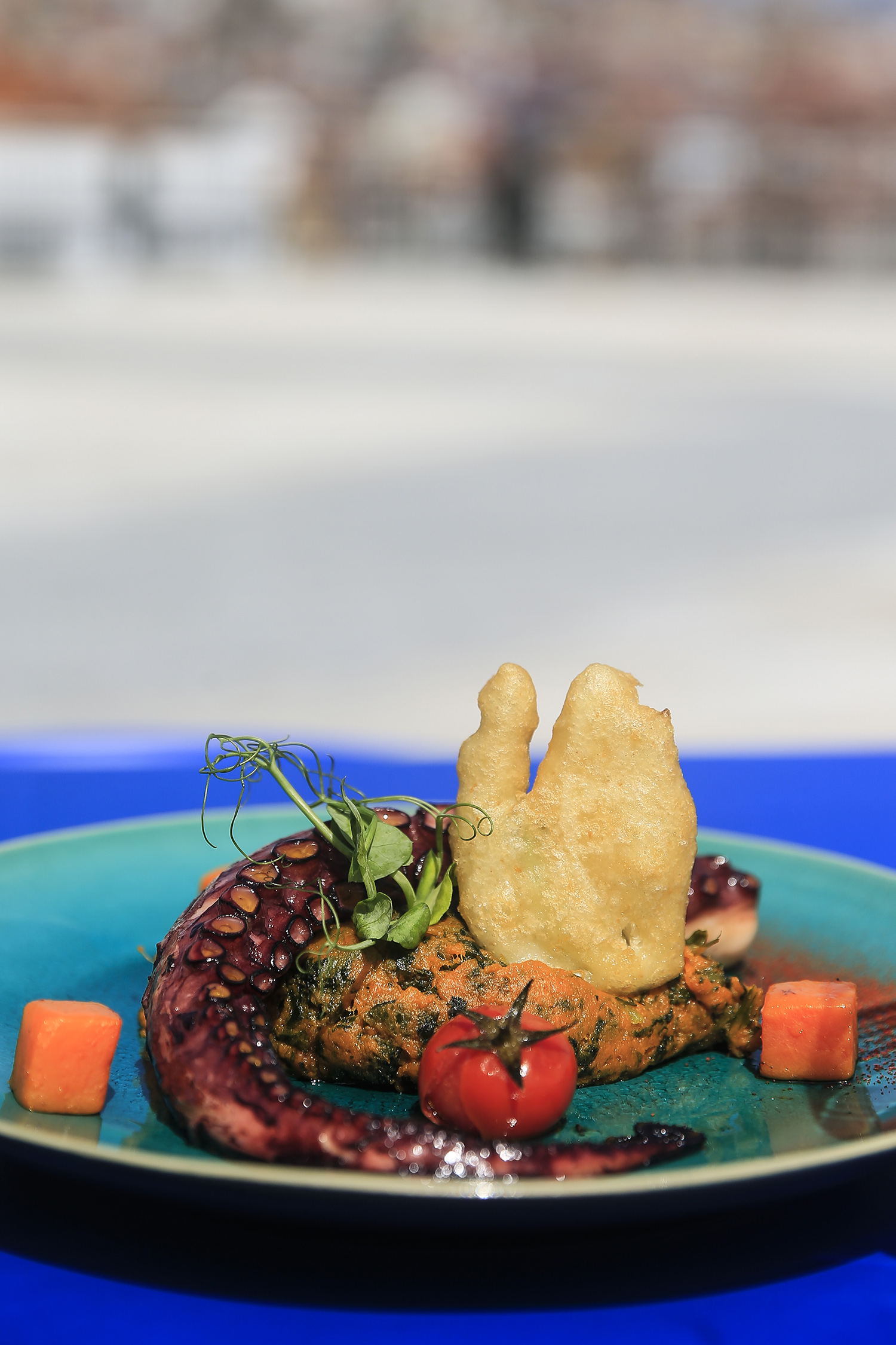 - Polvo com batata doce esmagada e grelos, tempura de funcho, azeite de tomilho. (Fotografia: Artur Machado/Global Imagens)