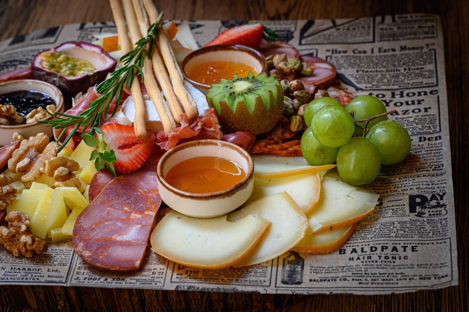 As opções incluem azeitonas marinadas, duas tábuas – uma de enchidos e outra de queijos -, molhos diversos para mergulhar gressinos e tostas, sanduíches de rosbife, presunto e uma vegetariana, acompanhadas por salada verde e chips de legumes, e natas ou queijadas para adoçar a boca.