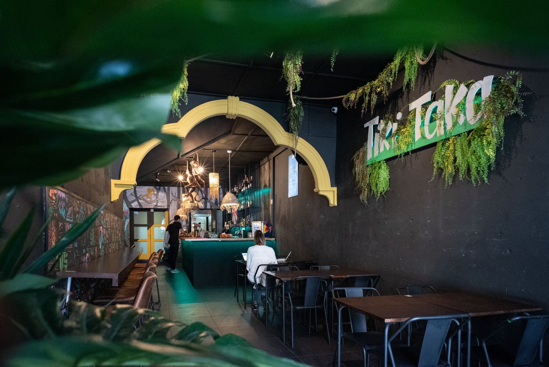 Macacos pendurados em lianas, um papagaio gigante que parece surgir de um portal na parede e, em frente, uma girafa segurando uma palhinha na boca, como que para sorver os cocktails que passam, são algumas das imagens decorativas que refletem o ambiente do recém-aberto Tiki Taka. O bar ocupa o espaço deixado pelo antigo Porto Sports Bar, na Praça Dona Filipa de Lencastre, um dos principais pontos de animação noturna portuense, antes da pandemia.