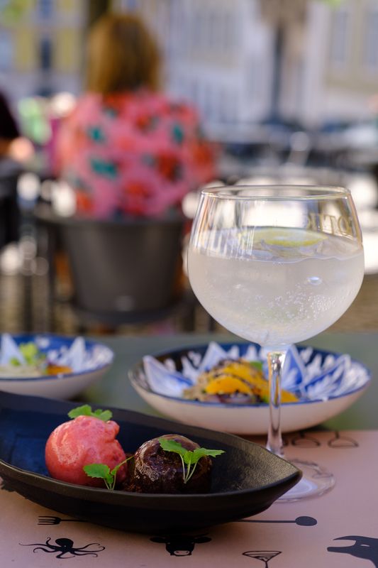 A esplanada, em socalcos de calçada portuguesa e com sombras naturais, é uma extensão do restaurante Tágide, no outro lado da rua, e um lugar ao sol para o chef Guilherme Freire brilhar com uma carta “mais ligeira, descontraída” e criativa. A norteá-lo estão as cozinhas mediterrânica e asiática, com forte pendor para o Japão, que adorou visitar. Disso são exemplo as gyosas recheadas com papada de porco preto, cogumelo shitake, couve e gengibre e com molho de soja, e que são já um best-seller.