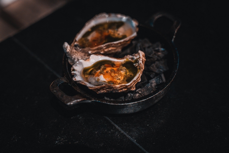 No Fogo, do chef Alexandre Silva, todos os pratos são confecionados na lenha, e a ostra, uma das protagonistas do menu de degustação, não foge à regra. Desde a abertura do restaurante nas Avenidas Novas, pouco antes da pandemia, que a preparação se mantém inalterada: proveniente da Aveiro, de Setúbal ou do Algarve, dependendo da época, o molusco começa por ir à brasa durante 30 segundos, até a concha abrir. “Existe uma sensação divertida quando se trinca a ostra, porque está fria por dentro mas quente por fora”, comenta o chef. O bivalve é ainda temperado com sumo de malagueta fermentada, manteiga fumada, óleo de salsa e pickles de talos de coentros, guarnições que acrescentam camadas de sabor e textura à complexidade natural da ostra.
