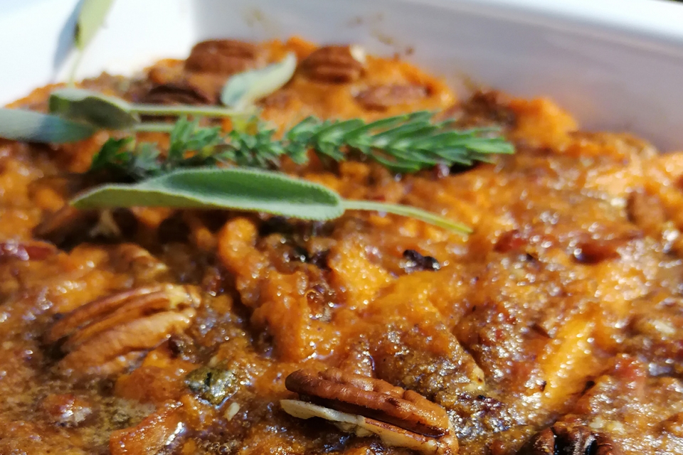 Puré de batata doce, nozes e bacon (8 pessoas)
