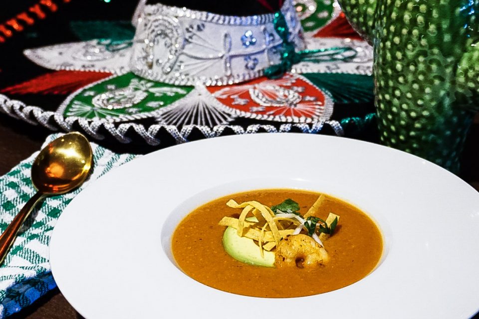 Descascar o camarão, tendo o cuidado de reservar as cascas e as cabeças. Num tacho com 500 ml de água colocar as cascas e as cabeças e deixar ferver por 30 minutos, colocá-las num coador e reservar a água. Picar a cebola, cenoura, o alho francês, o alho e os coentros. Num tacho médio, refogar tudo por 5 minutos em azeite com o alho em pó. Fritar os camarões neste refogado, adicionar o tomate e deixar refogar por mais 10 minutos. De seguida, verter sobre ele a água do camarão que ficou reservada e triturar tudo. Temperar com o chipotle, sal, pimenta e deixar ferver por mais 5 minutos. Servir a sopa com as tiras de milho fritas.