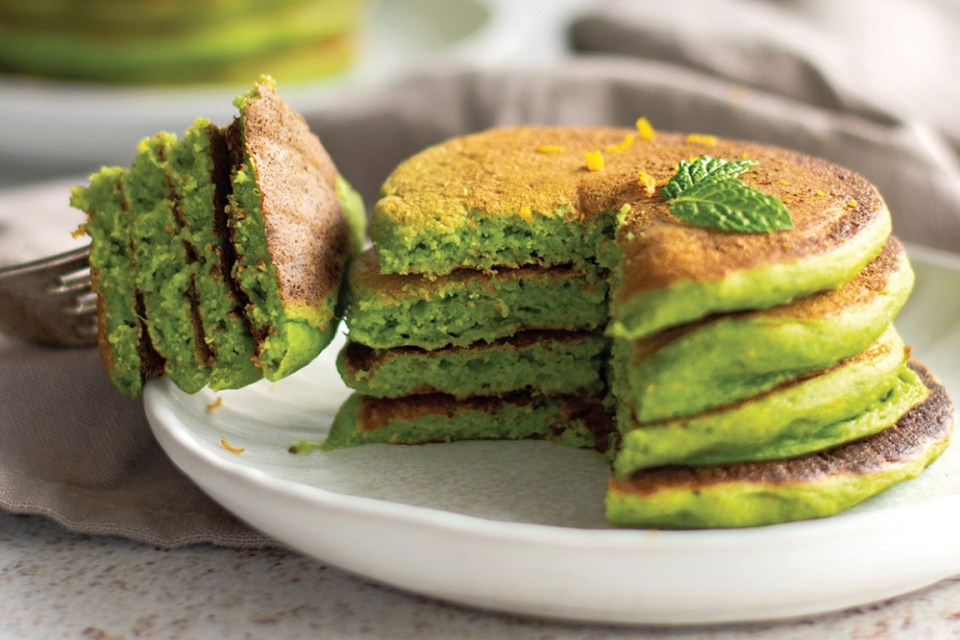 Lava muito bem a laranja, corta as extremidades (congela-as e usa para aromatizar cocktails ou fazer infusões) e tritura-a com os espinafres previamente lavados e escorridos, e a bebida de soja. À parte, numa tigela média, mistura os ingredientes secos com uma vara de arames e envolve a mistura anterior e os restantes ingredientes húmidos. Aquece em lume médio uma frigideira antiaderente e verte 2 colheres de sopa da massa por panqueca (deixa cair na vertical e não espalhes a massa, para que fiquem gordinhas). Quando começarem a formar-se bolhinhas à superfície e o rebordo ficar louro, vira com uma espátula e deixa cozinhar mais um pouco. Deixa as panquecas a arrefecer numa grelha de arrefecimento (para não ficarem húmidas em baixo) enquanto terminas a restante massa.