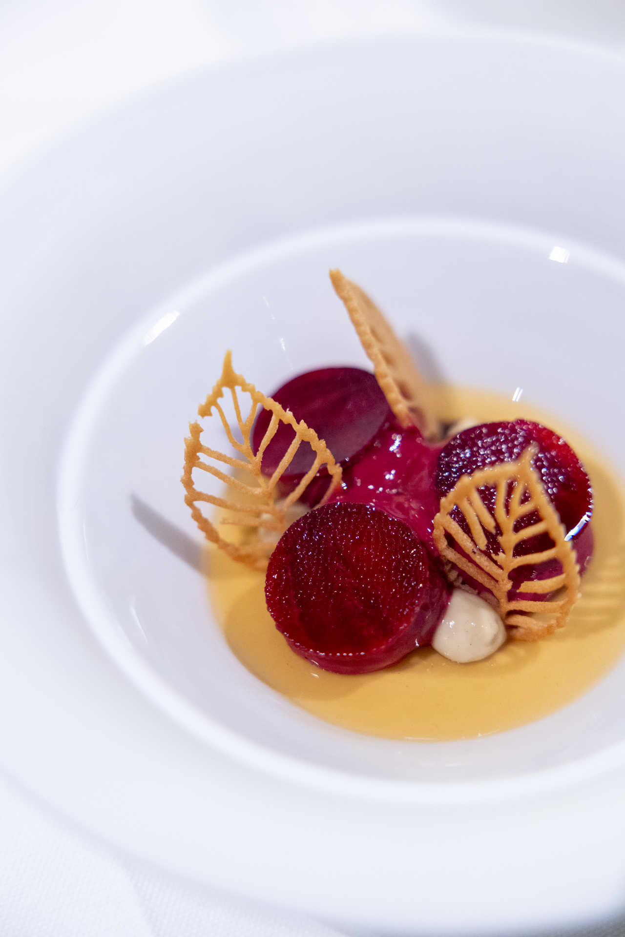 - Foie gras de pato, balsâmico di Modena, avelãs e beterraba. À direita, o projeto de vinhos do chef Vítor Matos. (Fotografias de Leonel de Castro/GI)