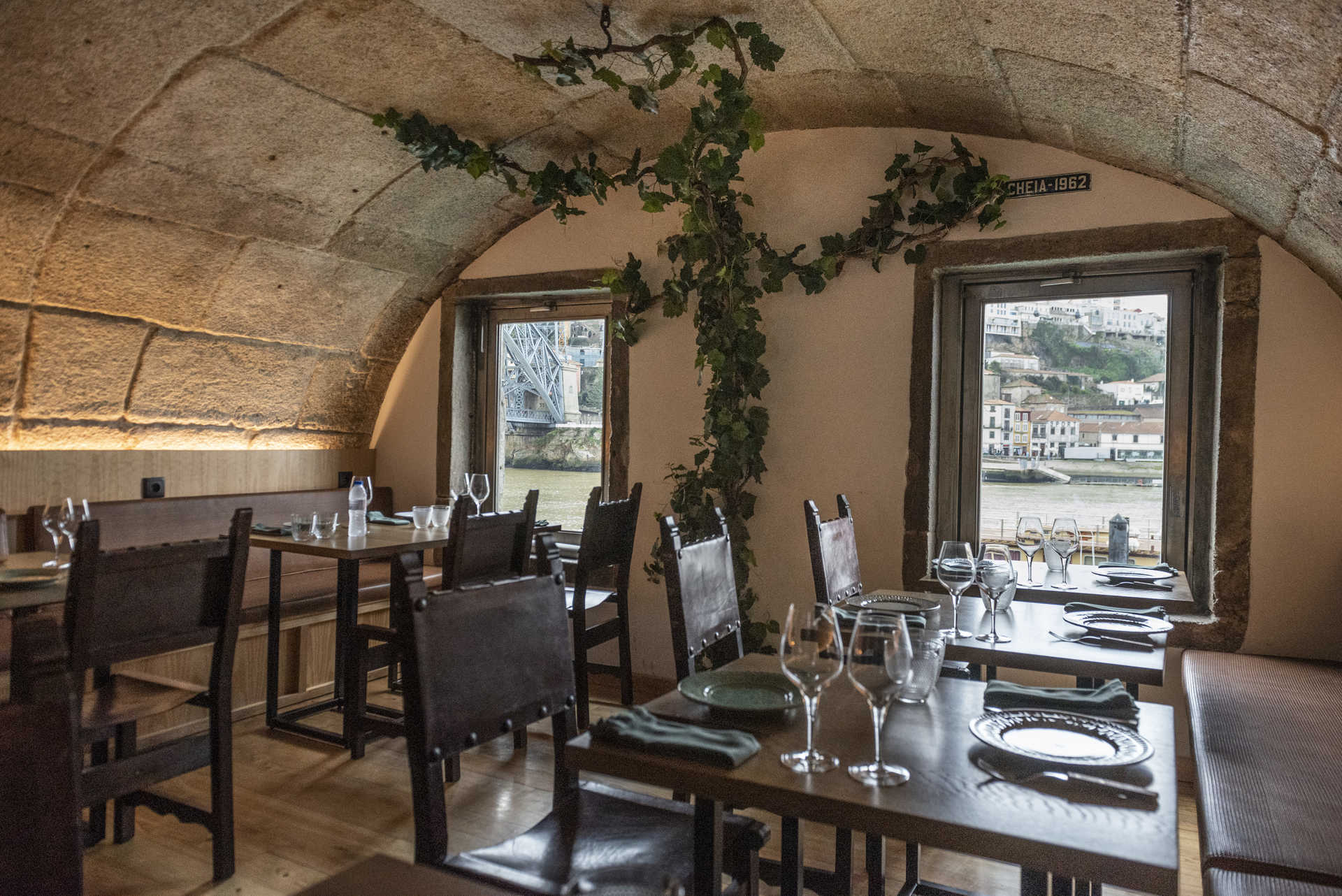 Petiscos e pratos tradicionais portugueses compõem a ementa da Taberna Rio, que abriu em junho passado, na Ribeira, mesmo em frente ao Douro, com vista para os barcos e a Ponte D. Luís I. O restaurante fica no antigo pano molhado da muralha fernandina, onde a água batia. Lá dentro, no primeiro andar, há uma placa a recordar a cheia de 1962, a maior das últimas décadas, e um gancho que remete para o passado comercial da zona. “Trazia-se para aqui a mercadoria que vinha do rio”, conta uma funcionária.