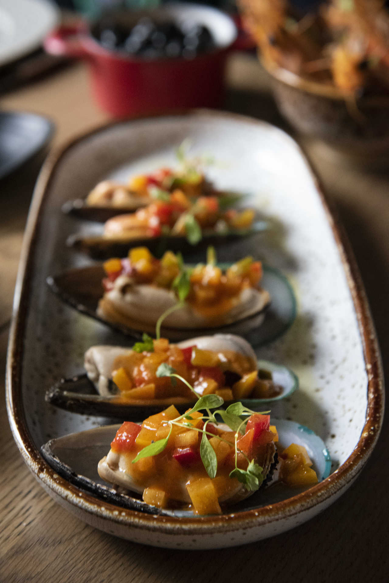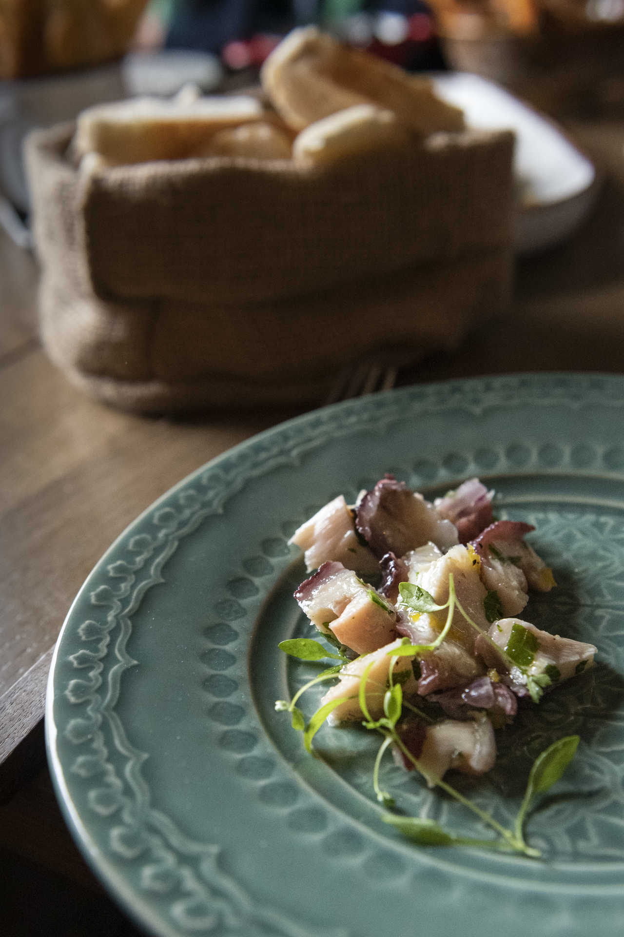 Para os pratos (das marcas nacionais Vista Alegre, Costa Nova e Bordallo Pinheiro) vão, sobretudo, petiscos: mexilhões com vinagrete de pimentos, camarões de Moçambique ao alho, saladinha de polvo, preguinho no pão com queijo da Serra, tábuas com pickles caseiros ou peixinhos da horta – estes últimos, servidos com maionese de lima, são campeões de vendas. Há ainda opções vegetarianas, como cogumelos selvagens ou legumes salteados.
