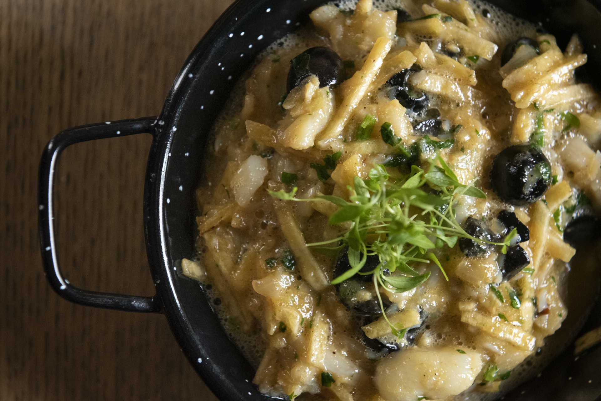 O espaço, com esplanada, zona de bar e elegante conjugação entre pedra e madeira, foi totalmente remodelado, conta Vasco Amaro, responsável pelo projeto, juntamente com António Leitão, Pedro Alexandre, José Maria e Diogo Proença, os mesmos sócios do vizinho Terra Nova, centrado no bacalhau e nas ostras. Vasco foi, até fins de 2018, diretor do Salpoente, especializado em bacalhau, em Aveiro. Na Taberna Rio, a proposta é diferente.
