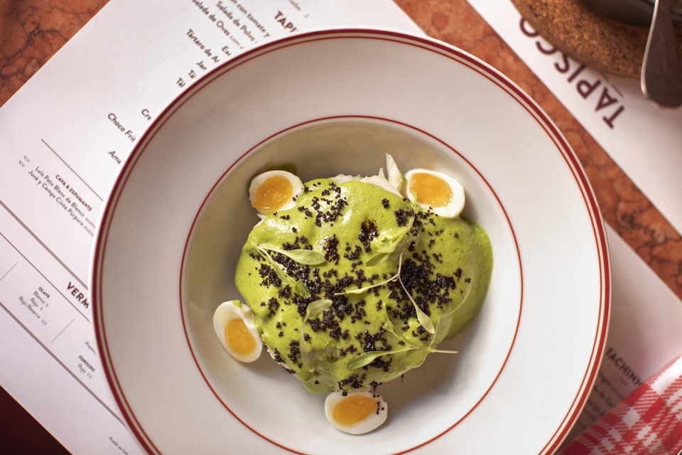 No couvert, também há sabores novos para provar, como o pão com azeite do chef, as azeitonas marinadas e o dip de anchovas. Nas sobremesas, mantêm-se os clássicos da casa – leia-se, mousse de chocolate negro com azeite e flor de sal, toucinho do céu com sorvete de tangerina, sorvete de limão com espuma de vermute, etc. Também é certo que no restaurante de Sá Pessoa, agora com o chef João Gama como braço-direito, continuam a caber as propostas que já fazem parte do ADN do Tapisco, muitos desde o início desta casa. Alguns desses clássicos são a La Bomba de Lisboa – uma generosa bola frita de alheira e batata -, o carabineiro grelhado com alioli, a paella negra com sépia e alioli, o choco frito com maionese de coentros e lima e o arroz de polvo com tomate e coentros.