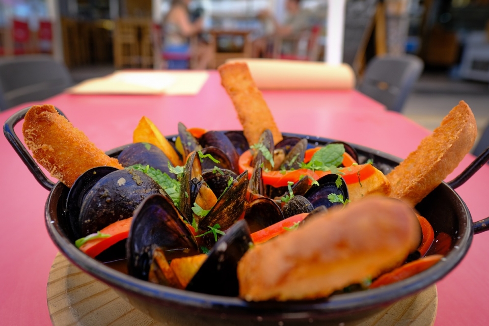 No Água Salgada, há petiscos como ensopado de mexilhão, arroz de lavagante e amêijoas à Bulhão Pato.