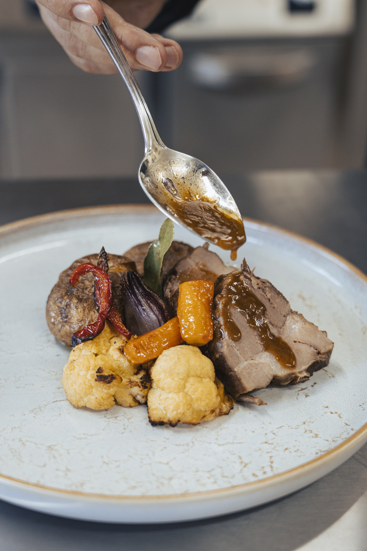 O creme de santola e coentros, o presunto de vaca fumado com azeite e manjericão e a sardinha picante com broa de milho e mousse de pimento assado são algumas das sugestões de entrada. Nos pratos principais destacam-se o arroz caldoso de bacalhau e o polvo do Algarve no pote de ferro; e nas carnes o cachaço de porco bísaro com legumes assados e a perna de galo celta em arroz de tomate coração de boi.
