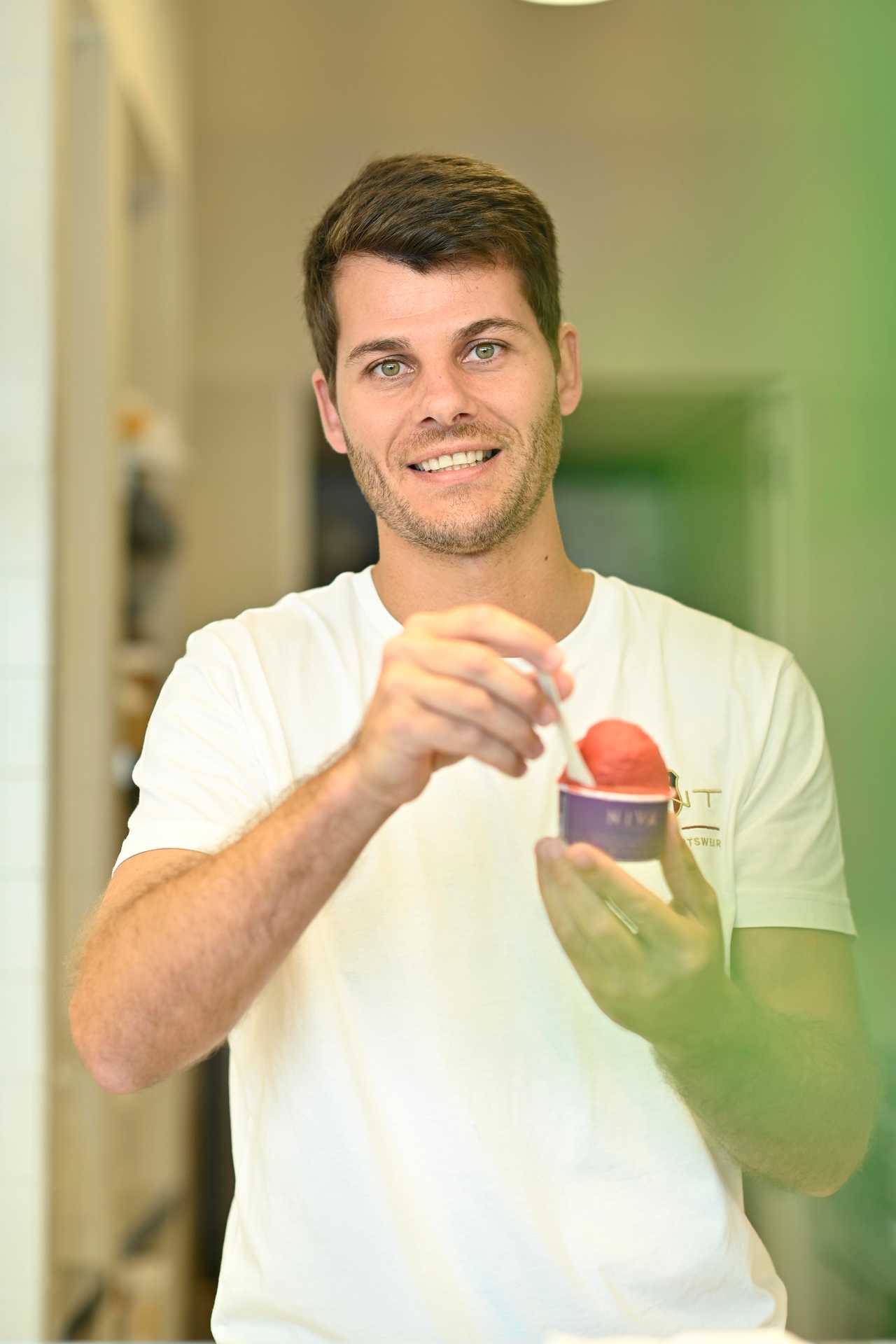 Opções assim, mais arrojadas, surgem pontualmente no menu, explica Alexandre Batata, que está à frente da Nivà de Matosinhos a tempo inteiro, e tem como sócios Carlos Moreira e Joana Magalhães. Depois de ter provado os gelados da marca italiana em Lisboa, onde existem duas lojas (a somar às de Turim e Cannes), Alexandre sentiu que eram “diferentes”. A seu ver, tal deve-se, desde logo, à criteriosa seleção das matérias-primas utilizadas – a começar pelo leite, oriundo de vacas do Alpes italianos, sem esquecer a fruta da época. O trio decidiu então investir abrir uma casa com essa oferta no Grande Porto.