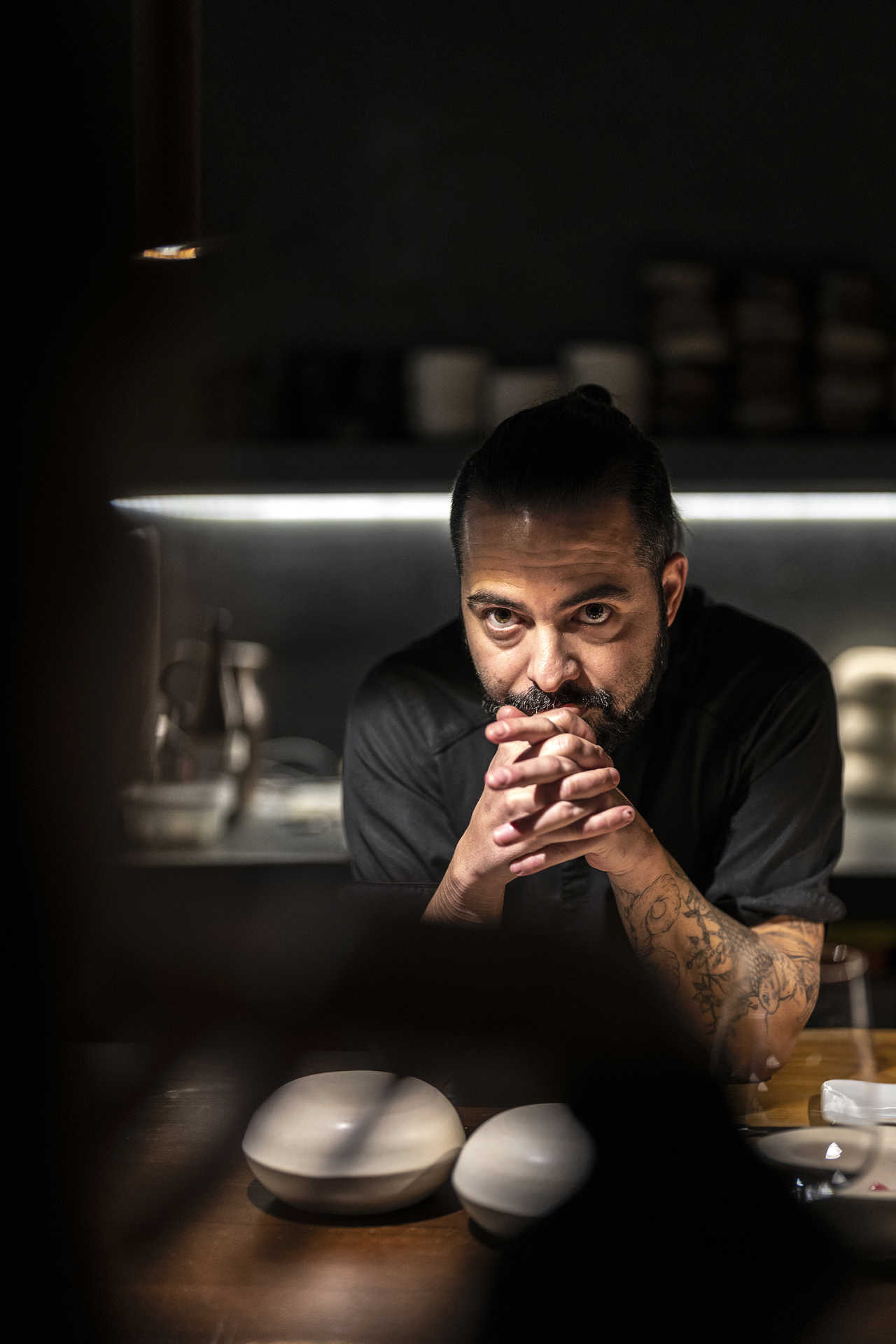 - Ricardo Casqueiro e uma das suas criações: merengue de dashi com toro, soja com emulsão de carvão e trufa. (Fotografias de Maria João Gala/Global Imagens)