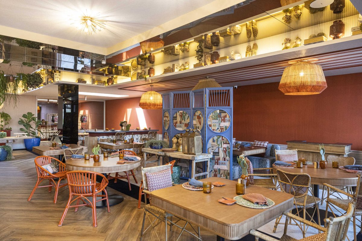 Nos pratos principais, há um clássico do chef, o seu bacalhau à Brás, além de cachaço de porco, spaghetti ao alho com gambas ou entrecôte, servido com batata e manteiga perfumada com limão e salsa. Tudo para saborear numa sala decorada por Joana Poças em tons ocres e azuis, repleta de objetos que a arquiteta foi juntando nas suas viagens e que remetem para outras latitudes.