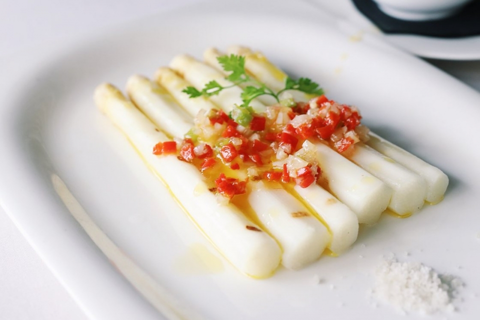 Começa, a seguir, o desfilar das verduras, primeiro com os espargos brancos de Tudela, uma vila junto à ribeira do rio Ebro, Navarra. “Esperamos a temporada dos espargos como a água de maio. Estes são uma maravilha!”, comenta Mikel. São apenas cozidos e passam levemente pela parrilla. Quem quiser, pode acompanhar com vinagrete. As favas, do mesmo produtor que trabalha diretamente com o chef, chegam à mesa guisadas com morcela de Biscaia, cebola, água e azeite. “Esta morcela tradicional é de sangue de porco, com alho francês, cebola e um pouquinho de canela, quase impercetível, apenas para suavizar”, explica. A outra leguminosa é a ervilha, servida com papada ibérica (parte da bochecha do porco curada), finamente fatiada.