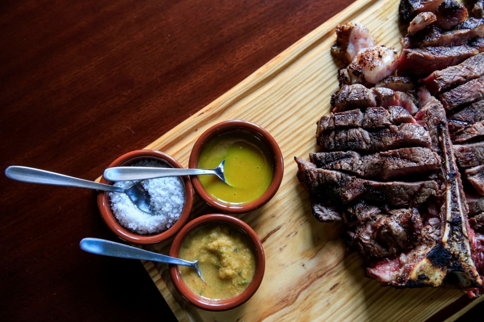 A carta é sucinta e reduzida ao essencial: carnes DOP e certificadas da Carnalentejana. O conceito passa por escolher uma peça de carne de bovino – vazia, T-bone, costeletão, naco de acém ou medalhão do lombo – que será grelhada, mal passada por defeito, e servida com chutney de pimentos picante, molho de mostarda e mel, chimichurri e flor de sal.