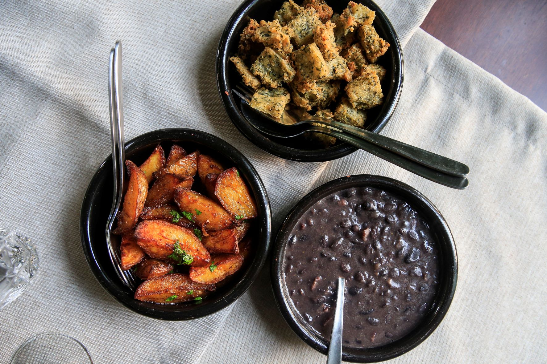 Para acompanhar há migas, salada três quartos, arroz da época, batatas assadas parecidas com wedges, feijão preto com bacon e um delicioso milho frito da madeira. Os acompanhamentos são servidos em doses individuais para incentivar a variedade e partilha.