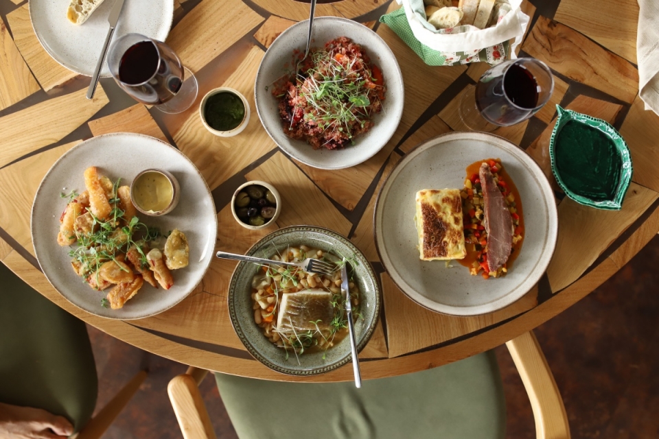 A sala, de aspeto contemporâneo, é ampla e iluminada por janelas com vista para a paisagem rural, onde o gado pasta livremente. Uma grande mesa, com tampo de madeira recuperada por um artesão e pés de ferro, convida a reuniões familiares e dialoga com a estrutura que emoldura o tronco de uma oliveira milenar, no pátio exterior do restaurante. À mesa, chegam os sabores de conforto com a mão da chef, que introduziu recentemente novos pratos para aquecer a época fria.